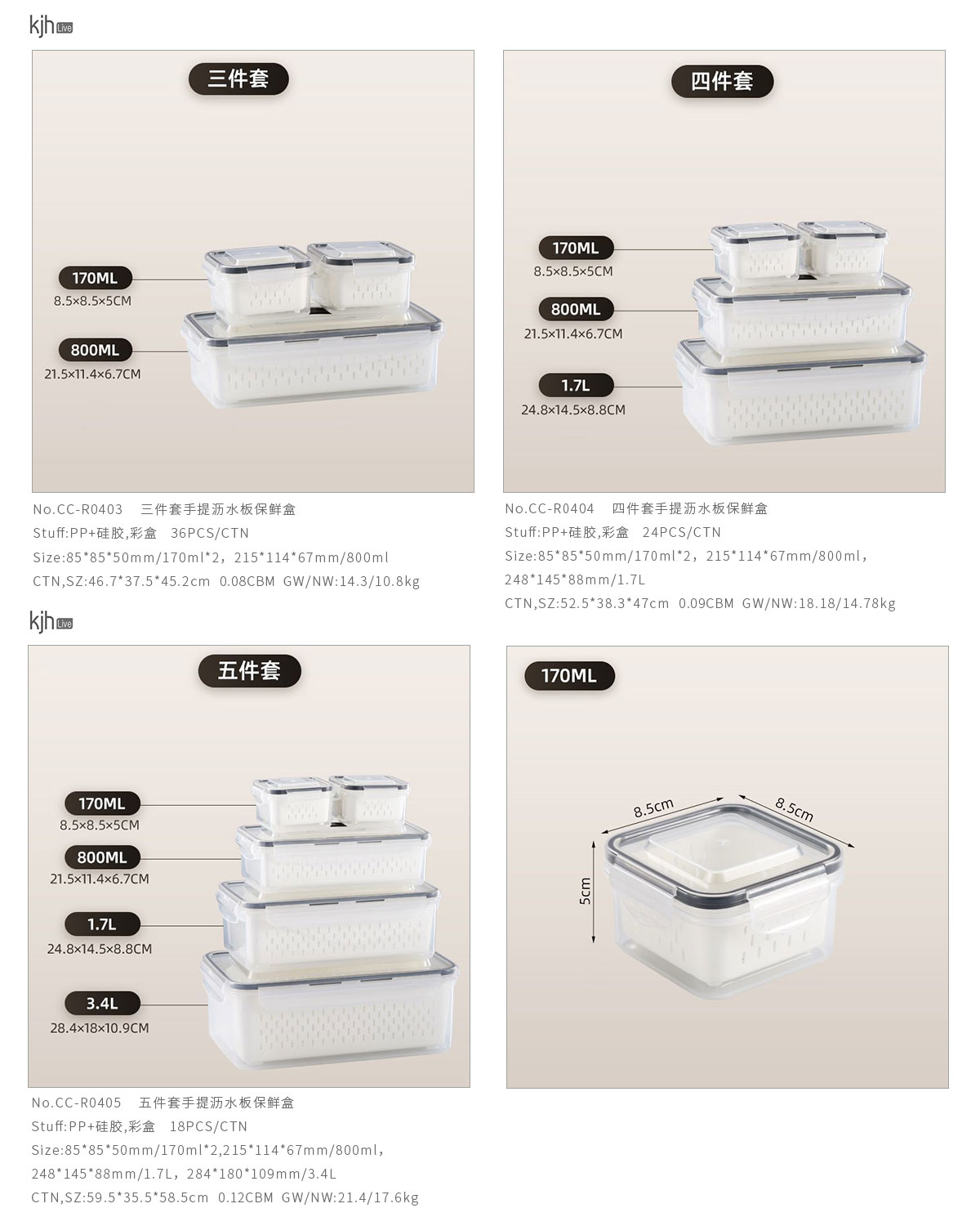 CC-R0405(五件套):85*85*50mm/170ml*2,215*114*67mm/800ml,248*145*88mm/1.7L,284*180*109mm/3.4L